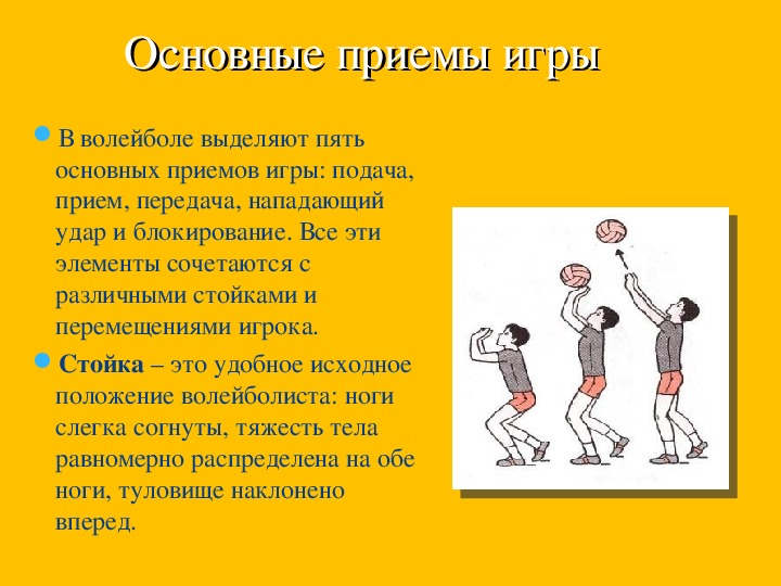 Волейбол состоит из следующих элементов: подача, прием, пас, нападающий удар, блок.