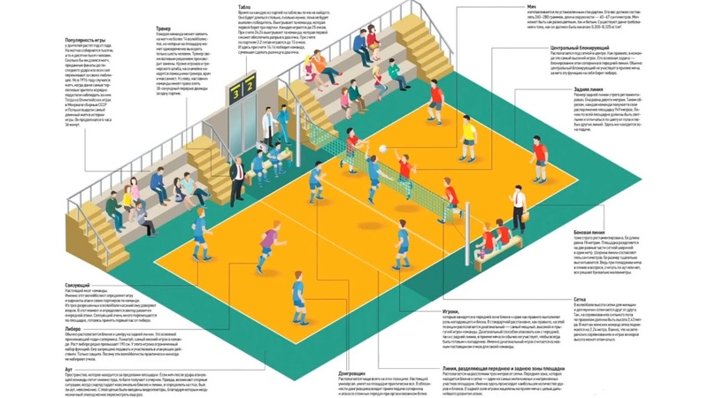То есть, если в теннисе может возникнуть кавардак, когдаодин игрок убежал слишком далеко в сторону и попал в площадку соперника, минуясетку, и это будет очко, в волейболе такому не бывать.