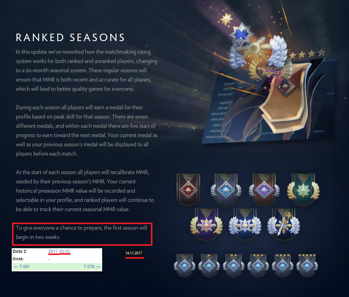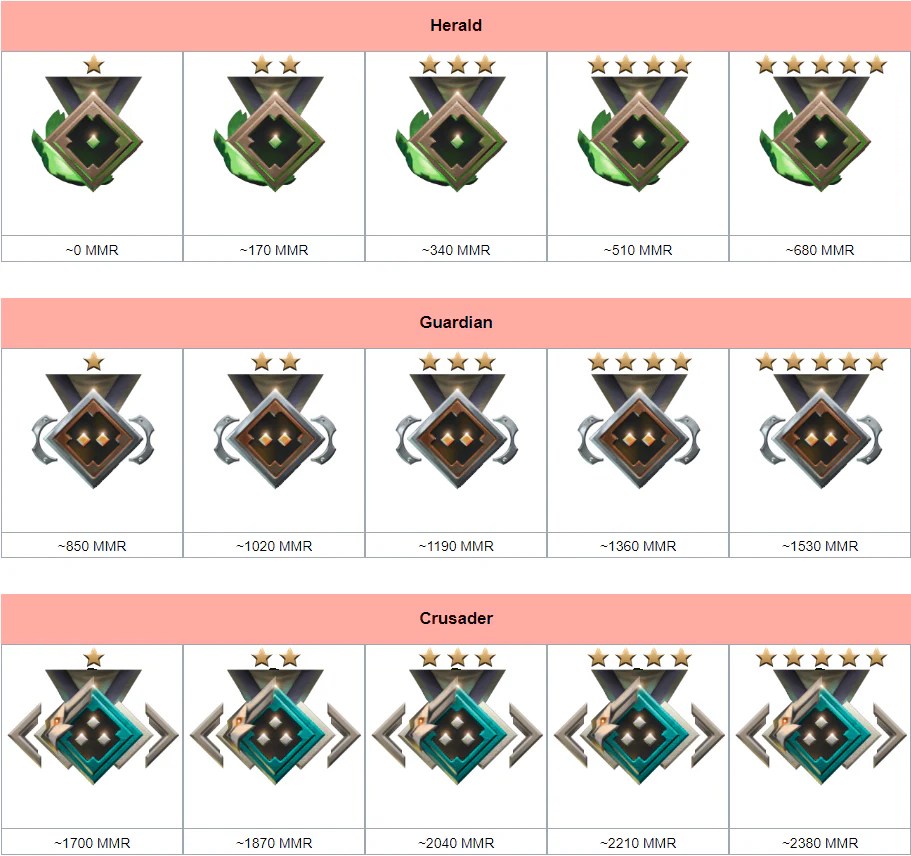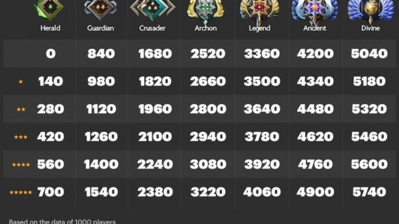 Соотношение рангов и MMR Dota 2 удобнее представлять в виде таблицы, показывающей, сколько очков рейтинга нужно для получения новой медали в Доте и перехода в следующий ранг. Над всеми медалями также видны дополнительные опознавательные знаки в виде звезд, показывающих, на каком уровне ранга находится игрок и как далеко до получения следующей медали. К примеру, над медалью Страж с 950 ММР отображено 2 звезды, а над тем же Стражем с 1450 ММР — 3 звезды. Приведенная выше таблица описывает, какой ранг какому ММР в Доте 2 соответствует в 5 сезоне.