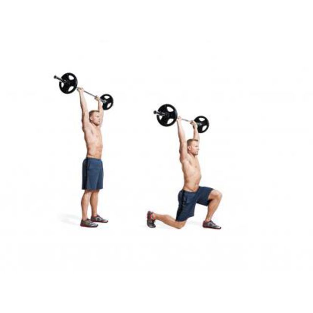 Упражнение с гирей. Ноги расставлены по бокам, гиря удерживается между ног в прямой руке, а ноги слегка согнуты в коленном суставе. При резком движении вес поднимается вперед, так, что образуется прямой угол. Важно, чтобы спина оставалась прямой при поднятии руки на девяносто градусов. На каждой руке выполняется до 8 повторений.