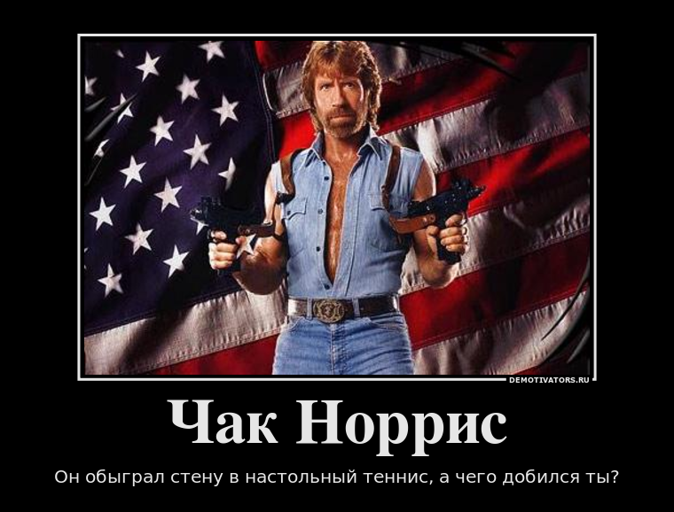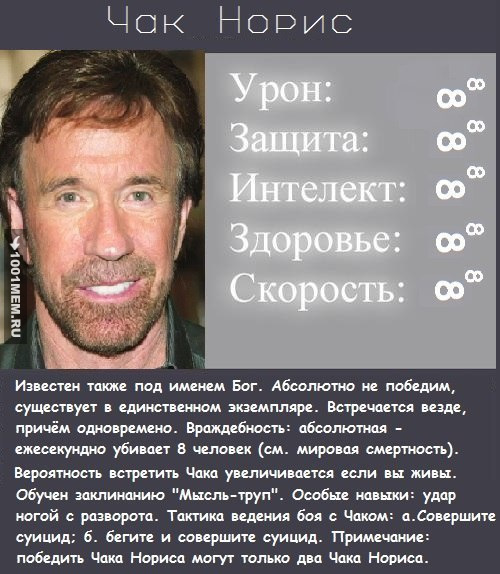 Также Чак Норрис – звезда интернет-мемов, например, выдуманных «Фактов о Чаке Норрисе»: пользователи сети придумывали шутки из разряда «Чака Норриса укусила кобра и умерла», «Чак Норрис досчитал до бесконечности.