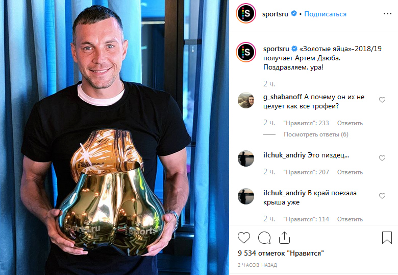 Действительно, я сначала подумал, что это жопа. Сейчас я понял, что это такой оригинальный подарок, такой огромный, вы постарались. Мне очень приятно. Спасибо, Sports.ru. Спасибо, что наконец в 2018/19 году вы начали писать правильные тексты и начали разбираться в футболе. Спасибо вам огромное, ребят».