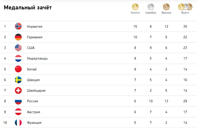 Южная Корея заняла далекое второе место с шестью золотыми медалями. Общее количество медалей России было почти эквивалентно количеству всех других стран-участниц вместе взятых.