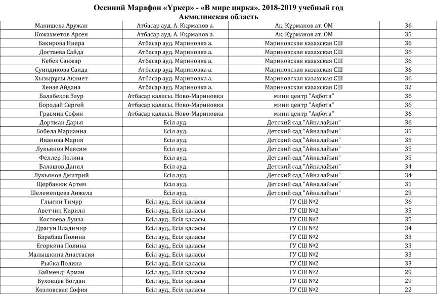 | 23 | Талапнур Байзак | Астана | 343 | 00:38:27 | 00:55:01 | 01:34:48 | 02:14:36 | 02:31:34 | 03:15:41 | 03:15:34 | |