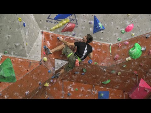 Мужской юниор B ехал по крутому оранжевому маршруту со слоперами, динамометрами и участком технического объема. Спортсмены справились с нижней частью легко, но многих смущали объемы. Однако Даниэль нашел способ и продолжил маршрут, в то время как Алфи мучительно приблизился к вершине.
