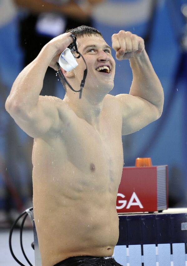 ЛОНДОН, Англия — 05 августа: (слева направо) пловцы Фелипе Франка Силва из Бразилии, Ален Бернар из Франции, Пол Бидерманн из Германии, Лиам Танкок из Великобритании и (слева направо в первом ряду) Никита Лобинцев из России, Райан Лохте из США и Андрей Говоров на церемонии бритья Gillette «Get Started» в семейном доме P&G 5 августа 2012 года в Лондоне, Англия.