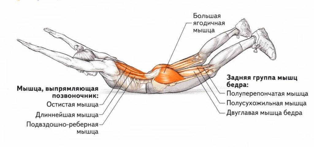 Дополнительно — ягодицы (большая ягодичная мышца), подколенные сухожилия, полусухожильная мышца.