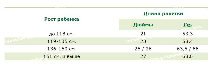 Однако вместо того, чтобы найти правильный размер рукоятки, родители захотят сосредоточиться на длине ракетки, которая обычно соответствует росту вашего ребенка. В следующей таблице показаны эти размеры.