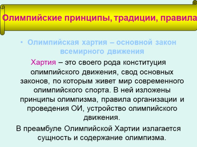 Олимпизм – это философия жизни, возвышающая и объединяющая в сбалансированное целое качества тела, воли и разума. Сочетая спорт с культурой и образованием, олимпизм стремится создать образ жизни, основанный на радости от усилий, образовательной ценности хорошего примера и уважении универсальных фундаментальных этических принципов.