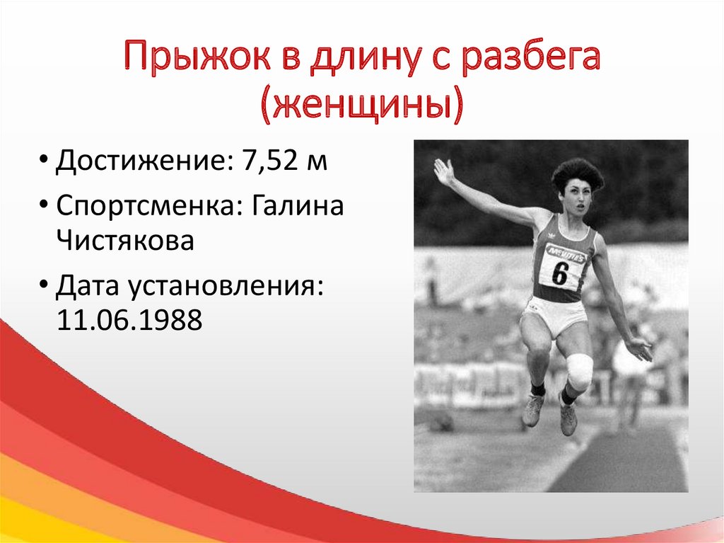 Один из старейших мировых рекордов легкой атлетики принадлежит советской прыгунье Галине Чистяковой. Лучший результат был показан летом 1988 года на мемориале братьев Знаменских, проводившемся в качестве подготовки к Олимпиаде в Сеуле. Галине Чистяковой удался прыжок на 7 метров 52 сантиметра, но из-за травмы на главных соревнованиях она сумела завоевать только бронзовую медаль.
