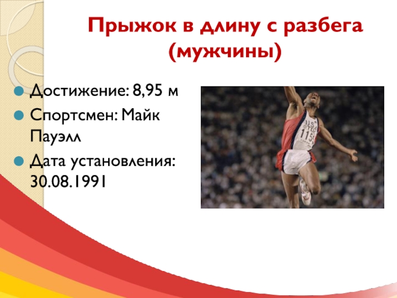| 8,95 м (29 футов 4 1/4 дюйма) | Майк Пауэлл (США) | 30 августа 1991 года |