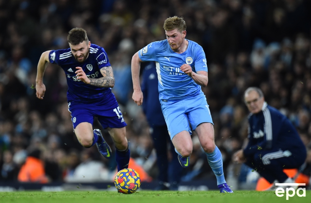 Нападающий действует под давлением Диаса и Стоунза и получает штраф, поскольку отбрасывает мяч обратно в сторону Родриго. Это лучшее заклинание Мадрида в игре.