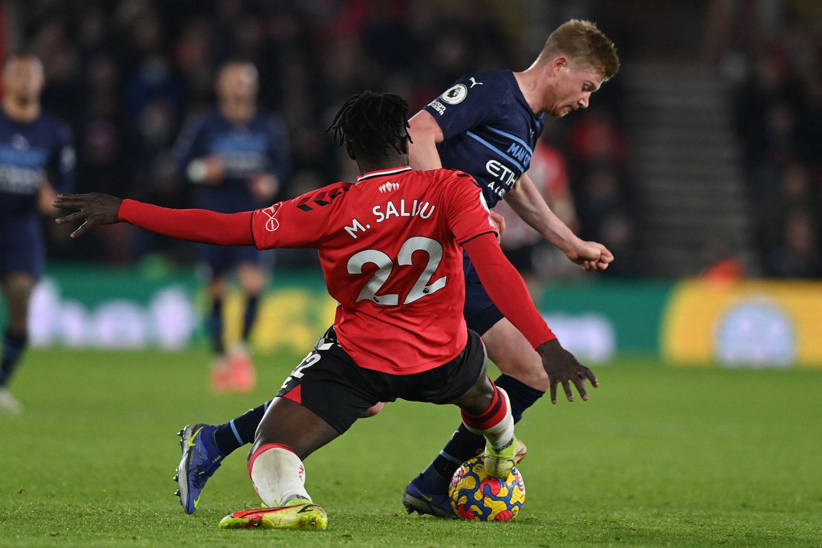 20-я минута : Джон Стоунз вырвался вперед из своей гибридной роли защитника/полузащитника, и Камавинга сбил его справа на краю штрафной площади. Любопытно, что судья Диаш играет с преимуществом, и проход заканчивается тем, что Гюндоган пробивает, прежде чем объяснить судье, что он действительно предпочел штрафной удар с 18-ярдовой линии.