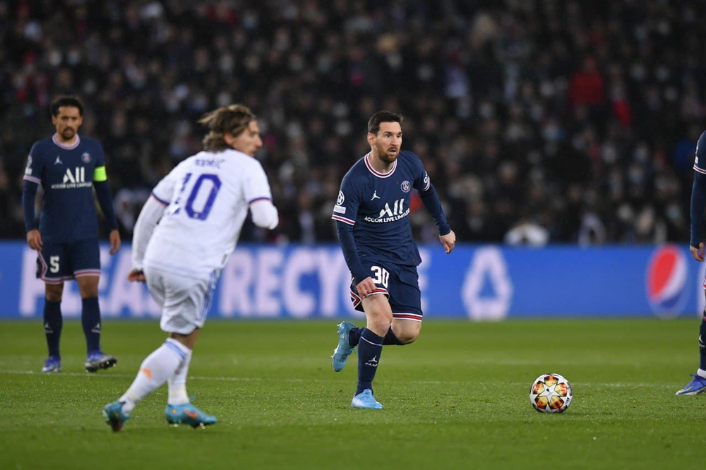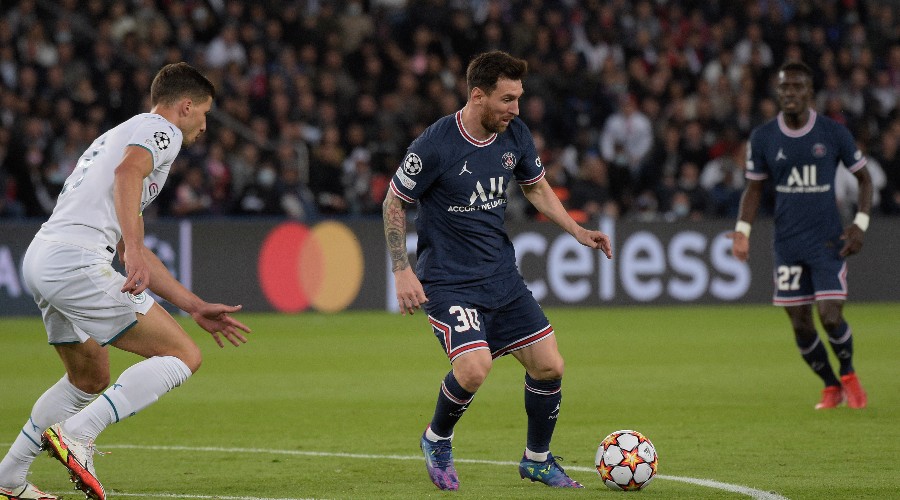 ПСЖ с четверкой защитников, продолжающих строить из-за спины. Месси делает еще одну попытку ведения мяча, на этот раз из более глубокой позиции, но толкает его плечом.