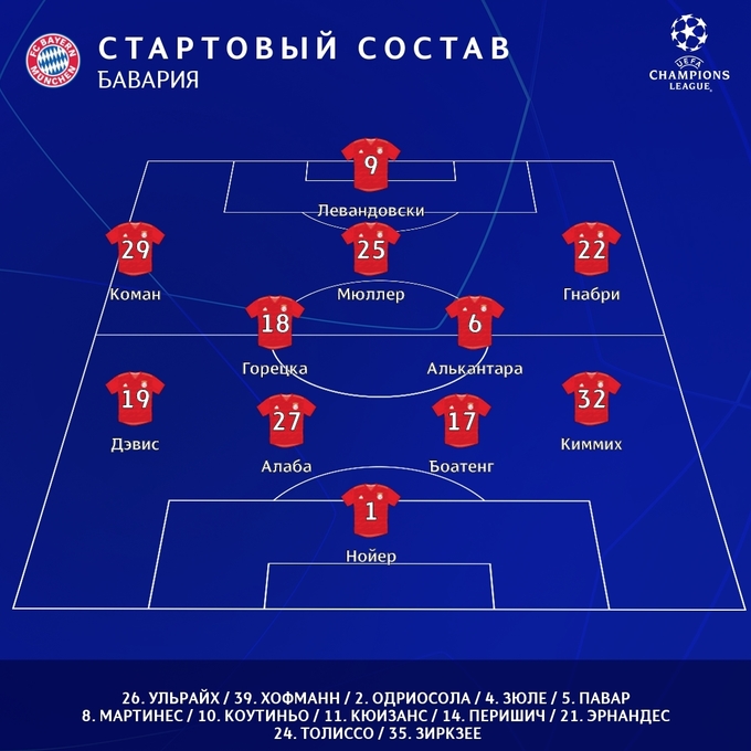 Зоммер — Станишич, Упамекано, де Лигт, Дэвис — Горецка, Киммих — Коман, Мюллер, Мусиала — Шупо-Мотинг