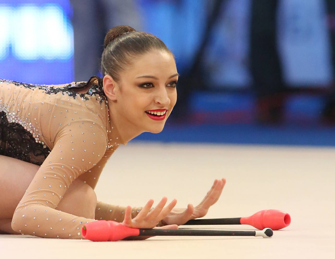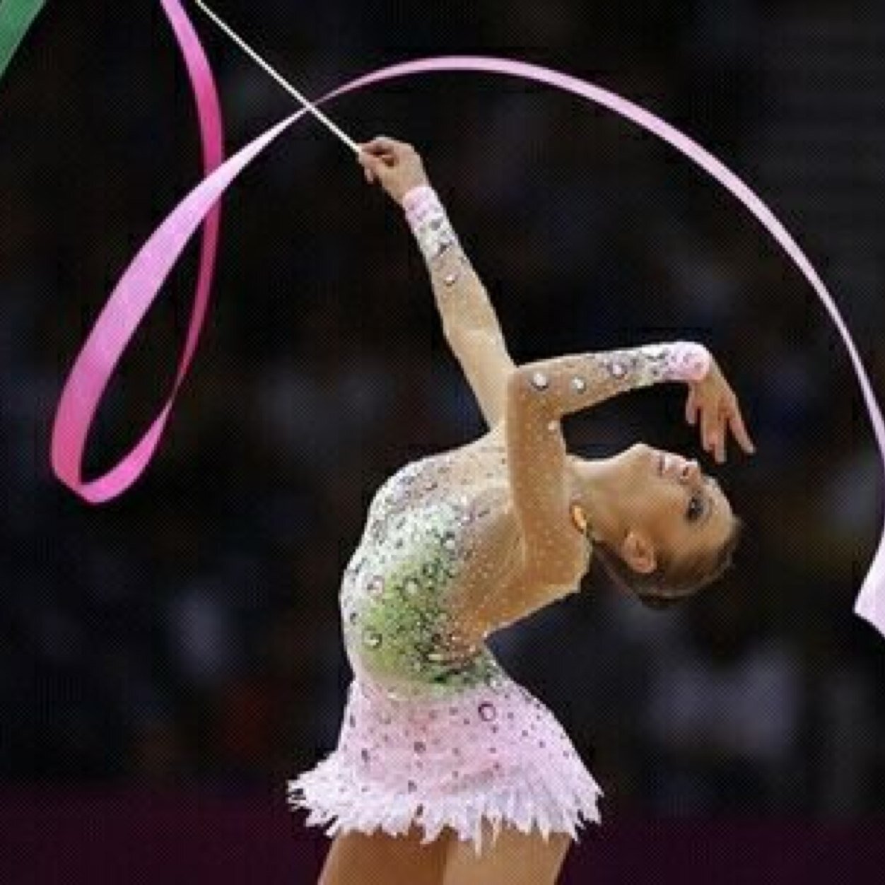 Канаева играет с таким плавным изяществом, снаряжение часто кажется частью ее тела, а не просто лентами, мячами, обручами и булавами, которыми она разбрасывается. Ее лента выглядела почти как живая, когда она крутила ее, танцуя и кружась в идеальном ритме под музыку Шопена. Ее молочно-розовый шарик, казалось, двигался сам по себе, пока она катала его по руке.
